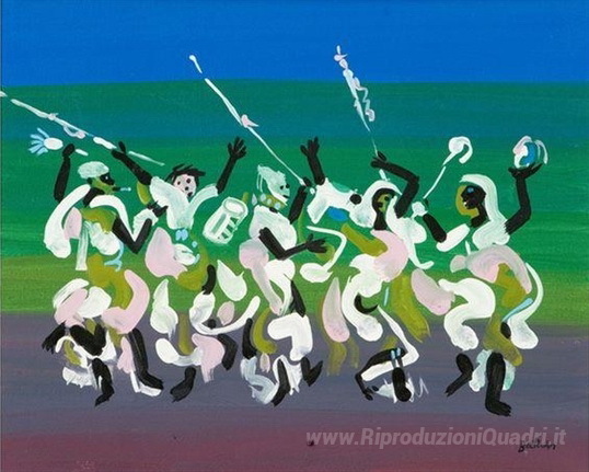 Ti offriamo una riproduzione artigianale su tela dell'opera famosa 'Danza africana' di Walter Battiss, dal Museo delle Riproduzioni.