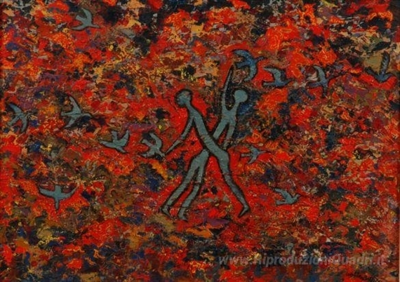 Ti offriamo una riproduzione artigianale su tela dell'opera famosa 'Due miniature con uccelli' di Walter Battiss, dal Museo delle Riproduzioni.