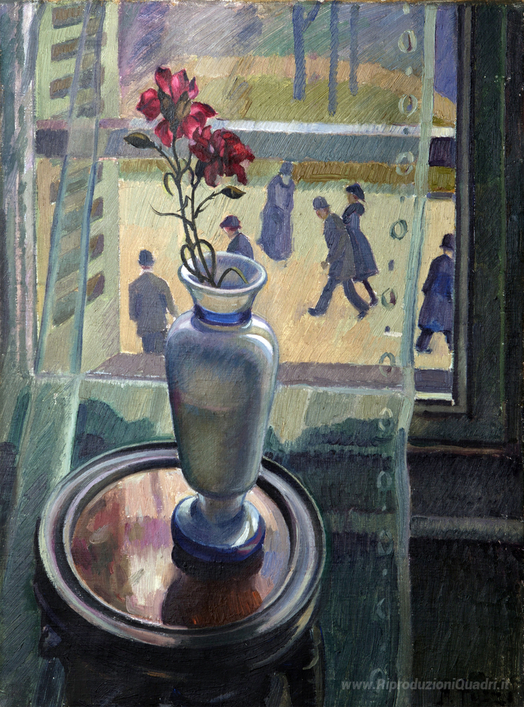 Ti offriamo una riproduzione artigianale su tela dell'opera famosa 'Finestra su Saint-Germain-des-Prés' di Mario Tozzi, dal Museo delle Riproduzioni.