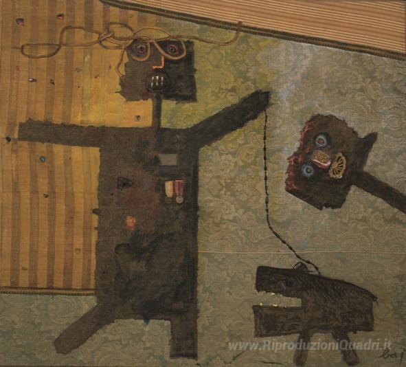 Ti offriamo una riproduzione artigianale su tela dell'opera famosa 'Generale se promenant avec son petit chien' di Enrico Baj, dal Museo delle Riproduzioni.