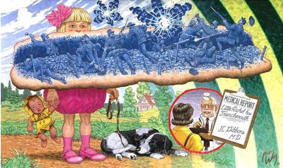 Ti offriamo una riproduzione artigianale su tela dell'opera famosa 'Gioco di parole' di Robert Williams, dal Museo delle Riproduzioni.