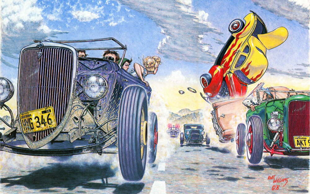 Ti offriamo una riproduzione artigianale su tela dell'opera famosa 'Hot Rod Race' di Robert Williams, dal Museo delle Riproduzioni.