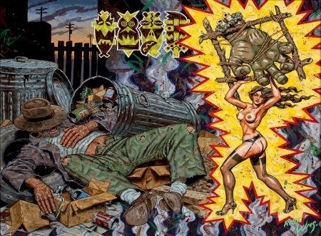 Ti offriamo una riproduzione artigianale su tela dell'opera famosa 'Il Flotsam Dilettante e la Piccola Visitazione che solo un Derel' di Robert Williams, dal Museo delle Riproduzioni.