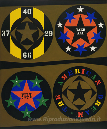 Ti offriamo una riproduzione artigianale su tela dell'opera famosa 'Il sogno americano, io' di Robert Indiana, dal Museo delle Riproduzioni.