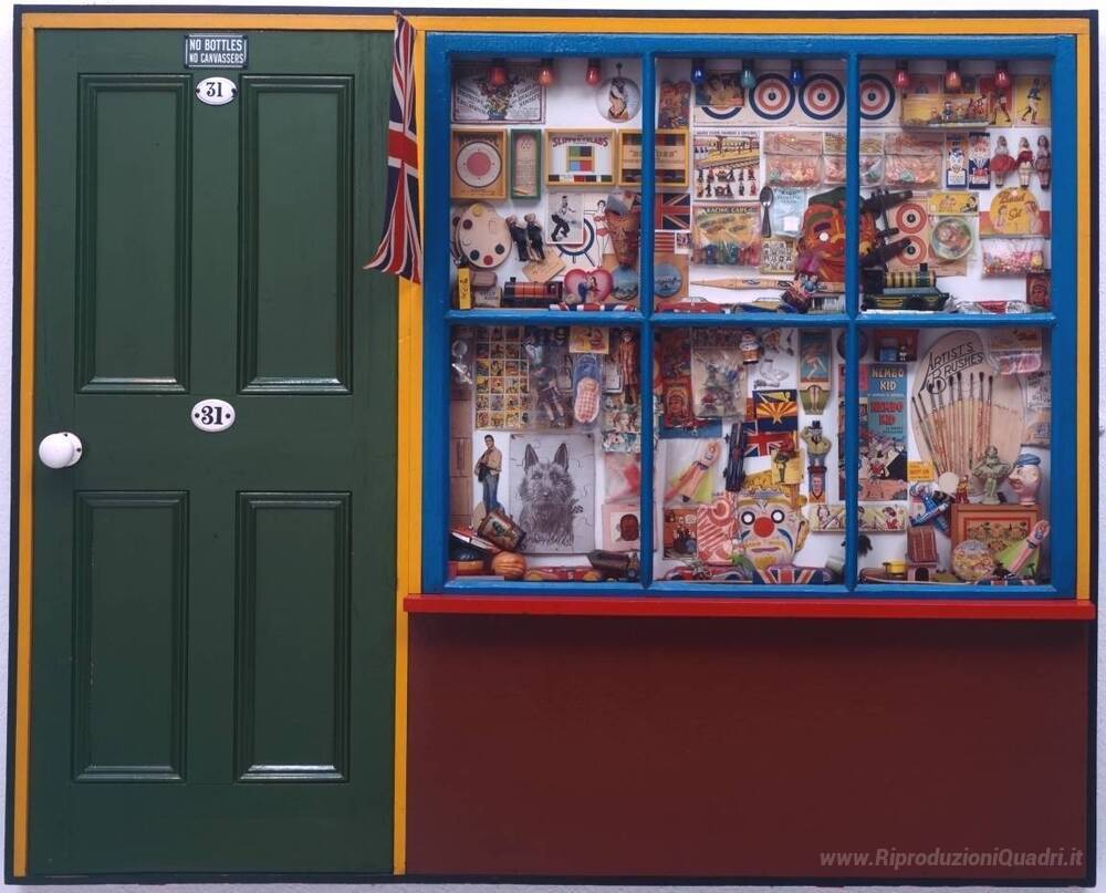 Ti offriamo una riproduzione artigianale su tela dell'opera famosa 'Il Toy Shop' di Peter Blake, dal Museo delle Riproduzioni.