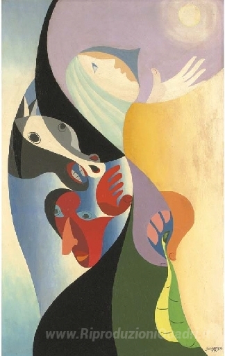 Ti offriamo una riproduzione artigianale su tela dell'opera famosa 'La bella e la Bestia' di Leopold Survage, dal Museo delle Riproduzioni.