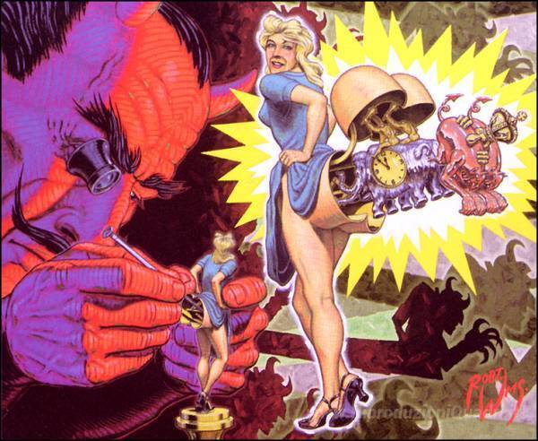 Ti offriamo una riproduzione artigianale su tela dell'opera famosa 'La ragazza con l'Asino Faberge' di Robert Williams, dal Museo delle Riproduzioni.