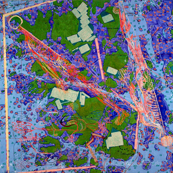 Ti offriamo una riproduzione artigianale su tela dell'opera famosa 'Laghi: Songlines' di Joyce Kozloff, dal Museo delle Riproduzioni.