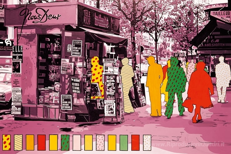 Ti offriamo una riproduzione artigianale su tela dell'opera famosa 'Le Kiosque' di Gerard Fromanger, dal Museo delle Riproduzioni.