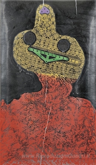 Ti offriamo una riproduzione artigianale su tela dell'opera famosa 'Le Maillot rouge' di Enrico Baj, dal Museo delle Riproduzioni.