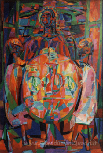 Ti offriamo una riproduzione artigianale su tela dell'opera famosa 'Les Pélerins d'Emmaus' di Alfred Manessier, dal Museo delle Riproduzioni.