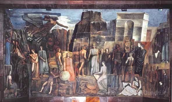 Ti offriamo una riproduzione artigianale su tela dell'opera famosa 'L'Italia nelle arti' di Mario Sironi, dal Museo delle Riproduzioni.