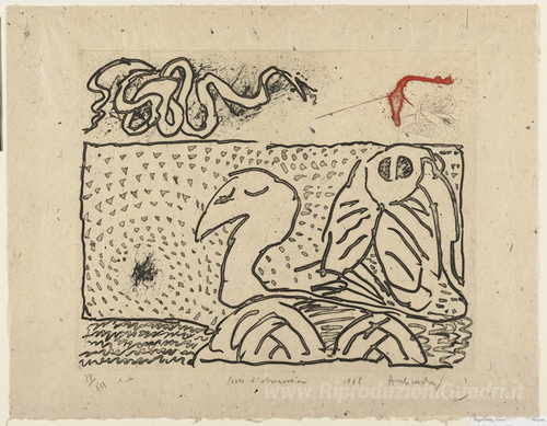 Benvenuti nella nostra selezione esclusiva di dipinti a olio, dove l'arte italiana prende vita attraverso opere di maestri indiscussi. Oggi vi presentiamo il capolavoro di Pierre Alechinsky, intitolato Look-Out Post (Poste d'osservazione). Alechinsky, una figura di spicco del gruppo COBRA, ha saputo fondere la tradizione europea con le influenze dell'arte primitiva e orientale, creando uno stile unico che incanta e stupisce.