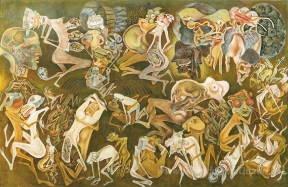 Ti offriamo una riproduzione artigianale su tela dell'opera famosa 'Nascita senza dolore' di Erro, dal Museo delle Riproduzioni.