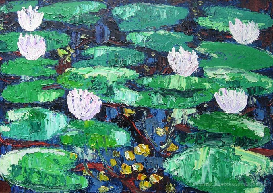 Ti offriamo una riproduzione artigianale su tela dell'opera famosa 'Ninfee' di Endre Bartos, dal Museo delle Riproduzioni.