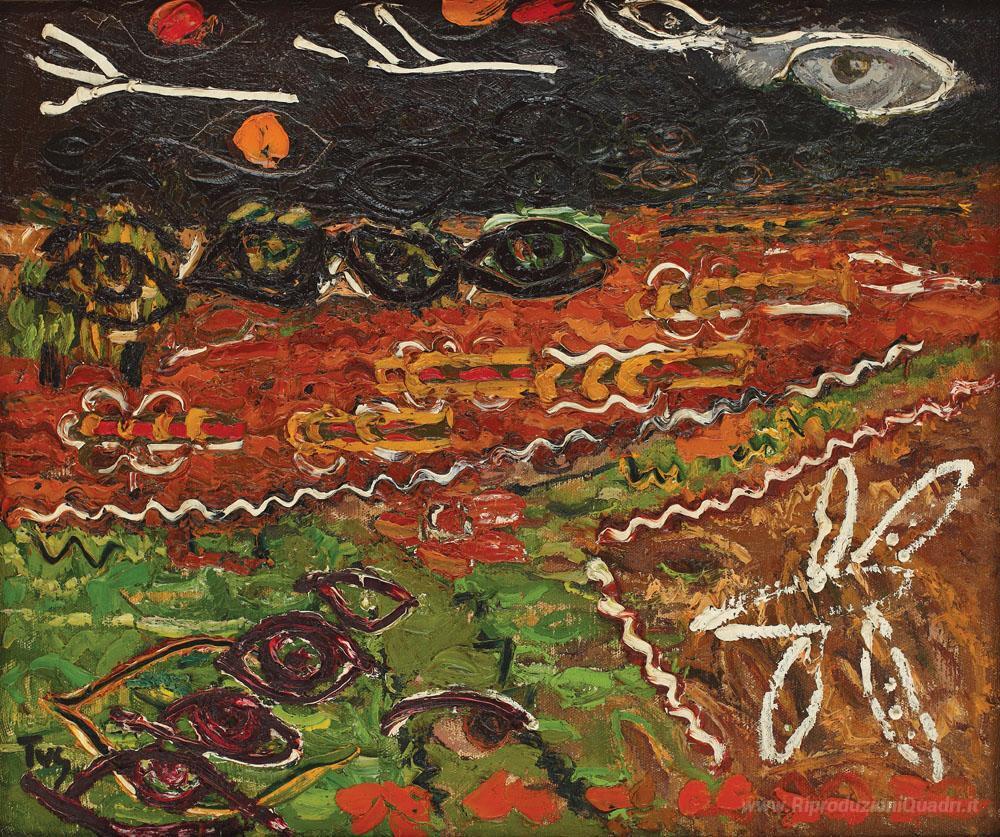 Ti offriamo una riproduzione artigianale su tela dell'opera famosa 'Occhi di Dio' di Ion Tuculescu, dal Museo delle Riproduzioni.