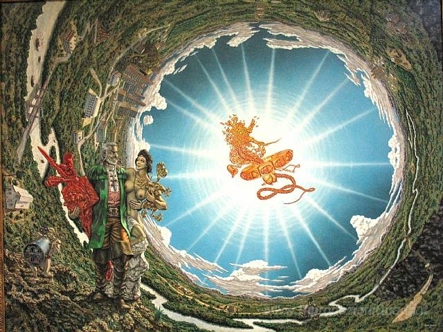 Ti offriamo una riproduzione artigianale su tela dell'opera famosa 'Pedoni Psychic su un orizzonte a spirale (baricentro)' di Robert Williams, dal Museo delle Riproduzioni.