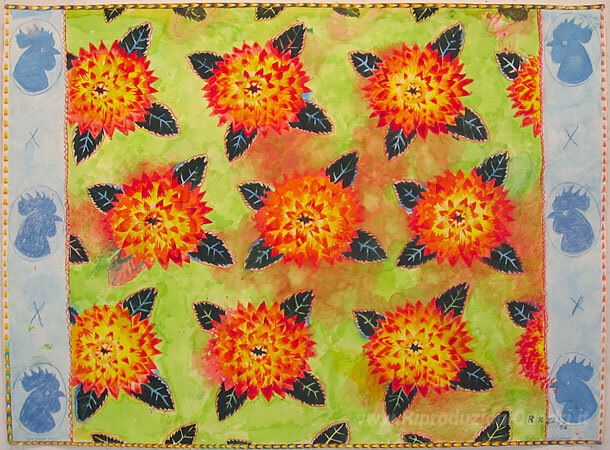 Ti offriamo una riproduzione artigianale su tela dell'opera famosa 'Pollo Fiore' di Robert Zakanitch, dal Museo delle Riproduzioni.