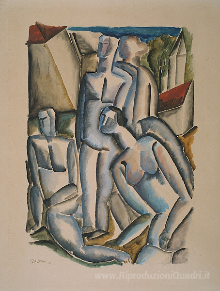 Ti offriamo una riproduzione artigianale su tela dell'opera famosa 'Quattro persone in un villaggio' di Ossip Zadkine, dal Museo delle Riproduzioni.