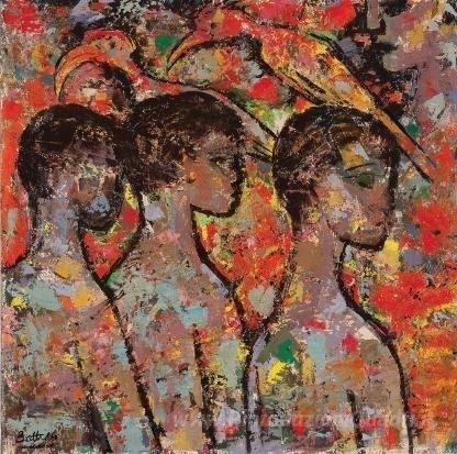 Ti offriamo una riproduzione artigianale su tela dell'opera famosa 'Quattro ragazzi e due uccelli' di Walter Battiss, dal Museo delle Riproduzioni.
