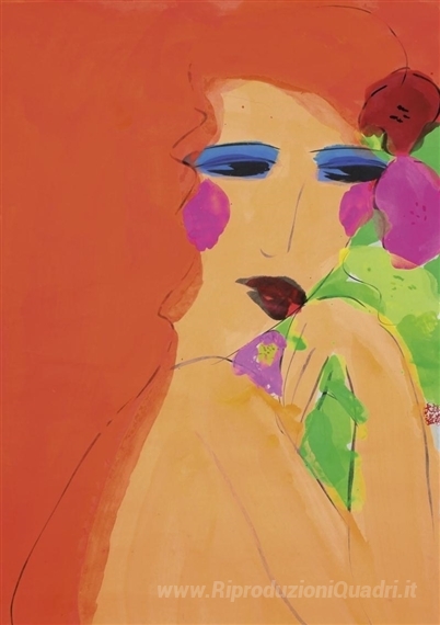 Ti offriamo una riproduzione artigianale su tela dell'opera famosa 'Ragazza con l'arancio capelli' di Walasse Ting, dal Museo delle Riproduzioni.