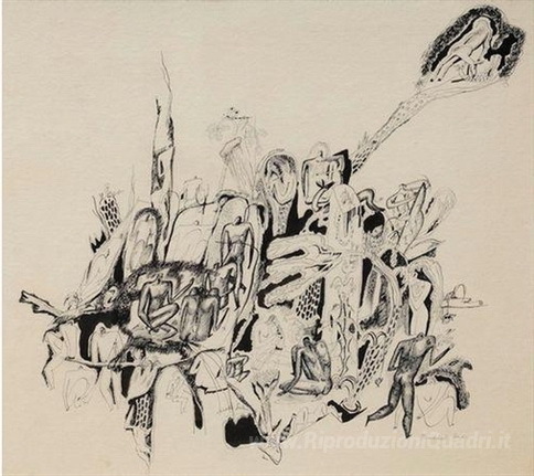 Ti offriamo una riproduzione artigianale su tela dell'opera famosa 'Scene Primordial' di Walter Battiss, dal Museo delle Riproduzioni.