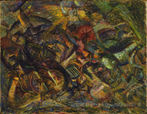 Ti offriamo una riproduzione artigianale su tela dell'opera famosa 'Scosse di un taxi' di Carlo Carra, dal Museo delle Riproduzioni.