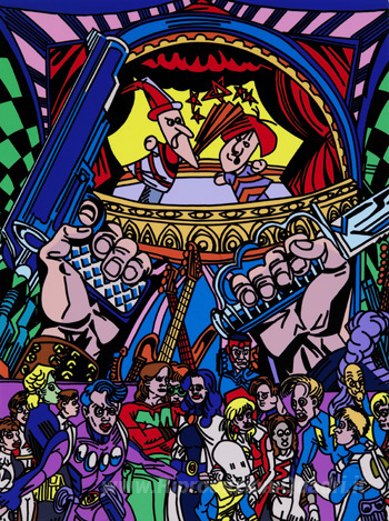 Ti offriamo una riproduzione artigianale su tela dell'opera famosa 'Stelle di sapone.' di Erro, dal Museo delle Riproduzioni.