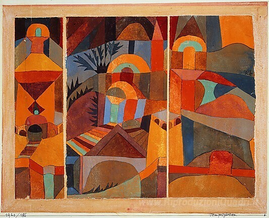 Ti offriamo una riproduzione artigianale su tela dell'opera famosa 'Temple Gardens' di Paul Klee, dal Museo delle Riproduzioni.