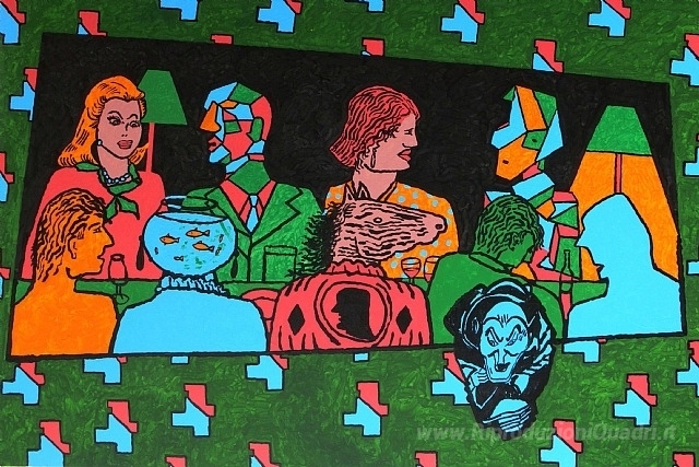 Ti offriamo una riproduzione artigianale su tela dell'opera famosa 'The Dinner Party' di Derek Boshier, dal Museo delle Riproduzioni.