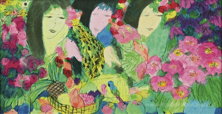 Ti offriamo una riproduzione artigianale su tela dell'opera famosa 'Tre donne, uccelli e frutta' di Walasse Ting, dal Museo delle Riproduzioni.