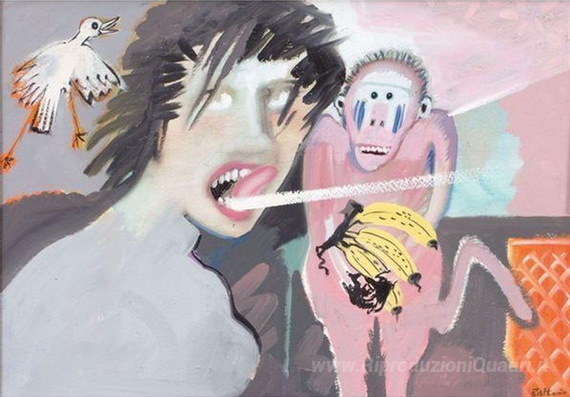 Ti offriamo una riproduzione artigianale su tela dell'opera famosa 'Uccello, Scimmia e Donna' di Walter Battiss, dal Museo delle Riproduzioni.