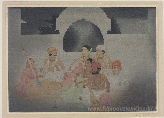 Ti offriamo una riproduzione artigianale su tela dell'opera famosa 'Un partito di musica al chiaro di luna' di Abanindranath Tagore, dal Museo delle Riproduzioni.