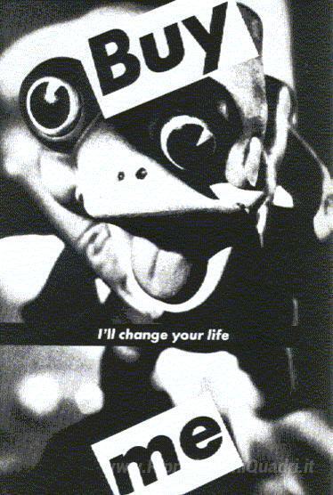 Ti offriamo una riproduzione artigianale su tela dell'opera famosa 'Untitled (Buy Me)' di Barbara Kruger, dal Museo delle Riproduzioni.