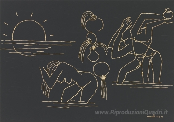 Ti offriamo una riproduzione artigianale su tela dell'opera famosa 'Varanasi III' di M.F. Husain, dal Museo delle Riproduzioni.