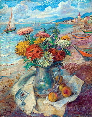 Ti offriamo una riproduzione artigianale su tela dell'opera famosa 'Americana ancora vita sulla spiaggia' di David Burliuk, dal Museo delle Riproduzioni.