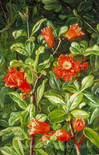 Ti offriamo una riproduzione artigianale su tela dell'opera famosa 'Fiori del melograno, dipinte a Tenerife' di Marianne North, dal Museo delle Riproduzioni.