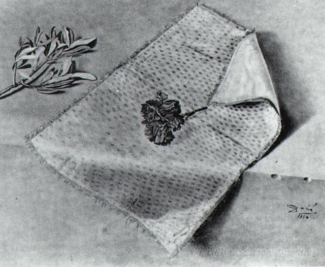 Ti offriamo una riproduzione artigianale su tela dell'opera famosa 'Garofano e Drappo d'oro' di Salvador Dali, dal Museo delle Riproduzioni.