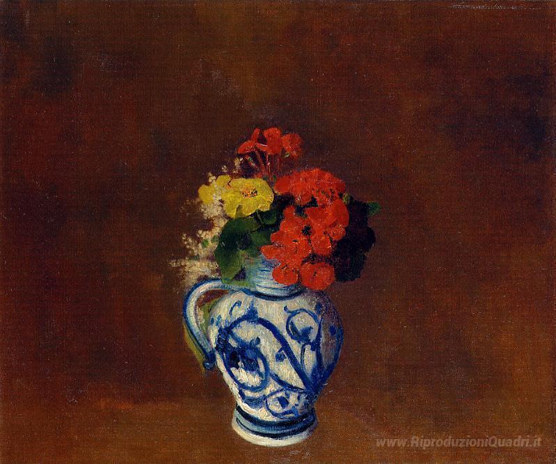 Ti offriamo una riproduzione artigianale su tela dell'opera famosa 'Gerani e altri fiori in un vaso in grès' di Odilon Redon, dal Museo delle Riproduzioni.