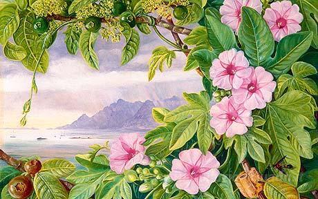Ti offriamo una riproduzione artigianale su tela dell'opera famosa 'Ipomoea e Vavangue con Mahe porto in lontananza' di Marianne North, dal Museo delle Riproduzioni.