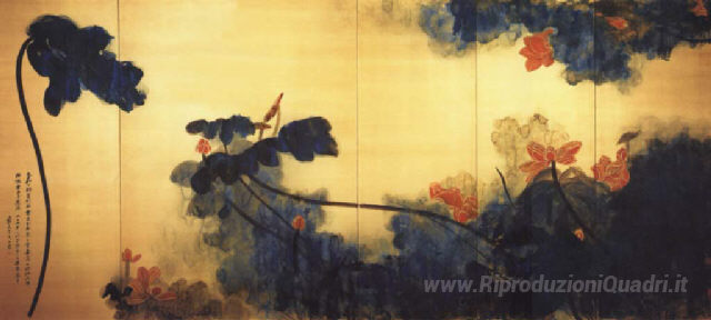 Ti offriamo una riproduzione artigianale su tela dell'opera famosa 'Loti Crimson sullo schermo oro' di Chang Dai-chien, dal Museo delle Riproduzioni.