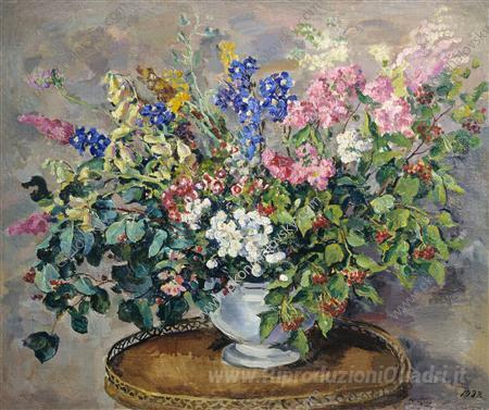 Ti offriamo una riproduzione artigianale su tela dell'opera famosa 'Mazzo di fiori' di Pyotr Konchalovsky, dal Museo delle Riproduzioni.