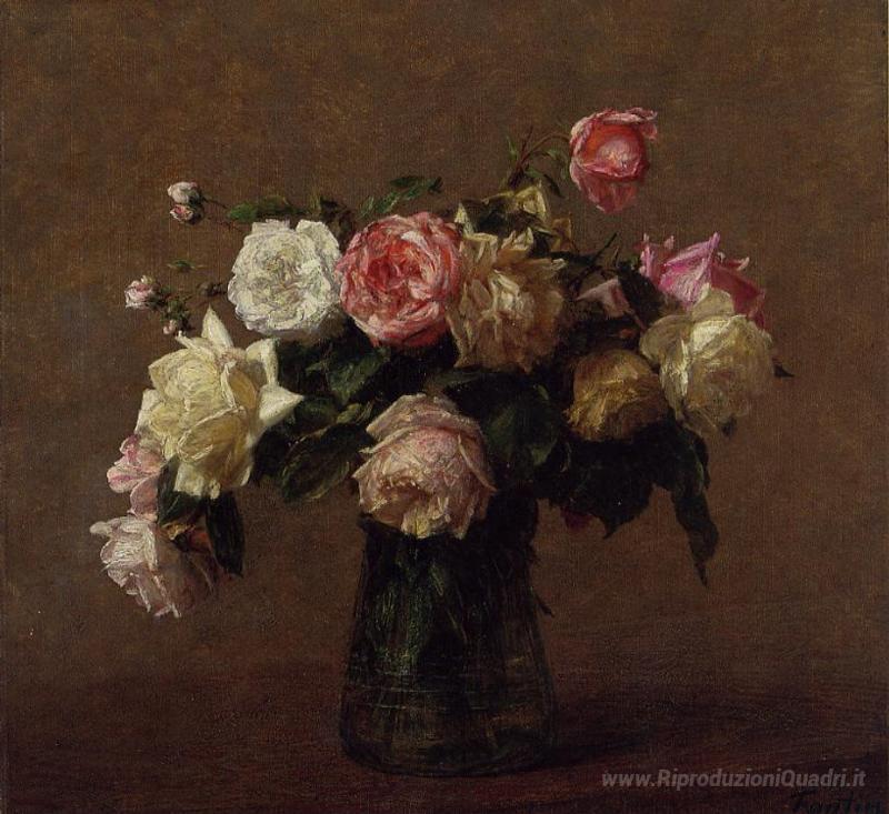 Ti offriamo una riproduzione artigianale su tela dell'opera famosa 'Mazzo di rose' di Henri Fantin-Latour, dal Museo delle Riproduzioni.