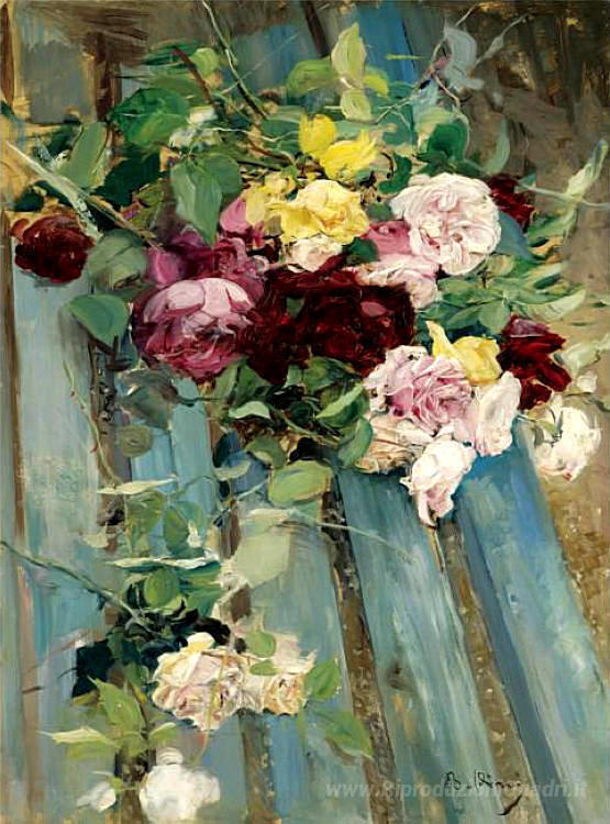 Ti offriamo una riproduzione artigianale su tela dell'opera famosa 'Natura morta con Rose' di Giovanni Boldini, dal Museo delle Riproduzioni.