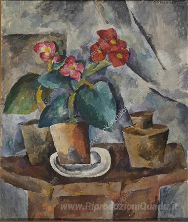 Ti offriamo una riproduzione artigianale su tela dell'opera famosa 'Natura morta. Fiori nelle banche. Begonie.' di Pyotr Konchalovsky, dal Museo delle Riproduzioni.