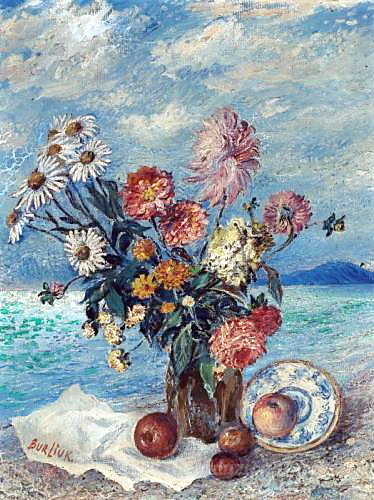 Ti offriamo una riproduzione artigianale su tela dell'opera famosa 'Natura morta in riva al mare' di David Burliuk, dal Museo delle Riproduzioni.