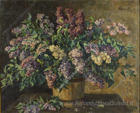 Ti offriamo una riproduzione artigianale su tela dell'opera famosa 'Natura morta. Lillà nella vasca.' di Pyotr Konchalovsky, dal Museo delle Riproduzioni.
