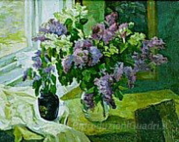 Ti offriamo una riproduzione artigianale su tela dell'opera famosa 'Natura morta. Lillà.' di Pyotr Konchalovsky, dal Museo delle Riproduzioni.