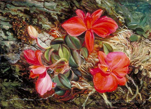 Ti offriamo una riproduzione artigianale su tela dell'opera famosa 'Orchid brasiliano' di Marianne North, dal Museo delle Riproduzioni.