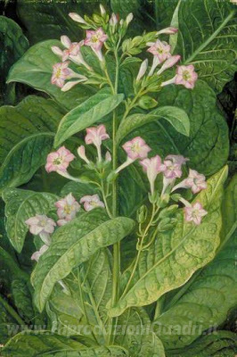 Ti offriamo una riproduzione artigianale su tela dell'opera famosa 'Tabacco Comune' di Marianne North, dal Museo delle Riproduzioni.
